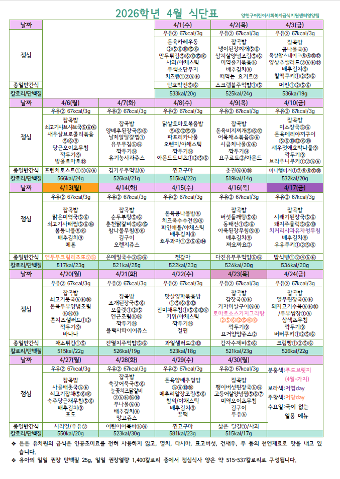 2026년 4월 친환경 유치원급식 식단표입니다.