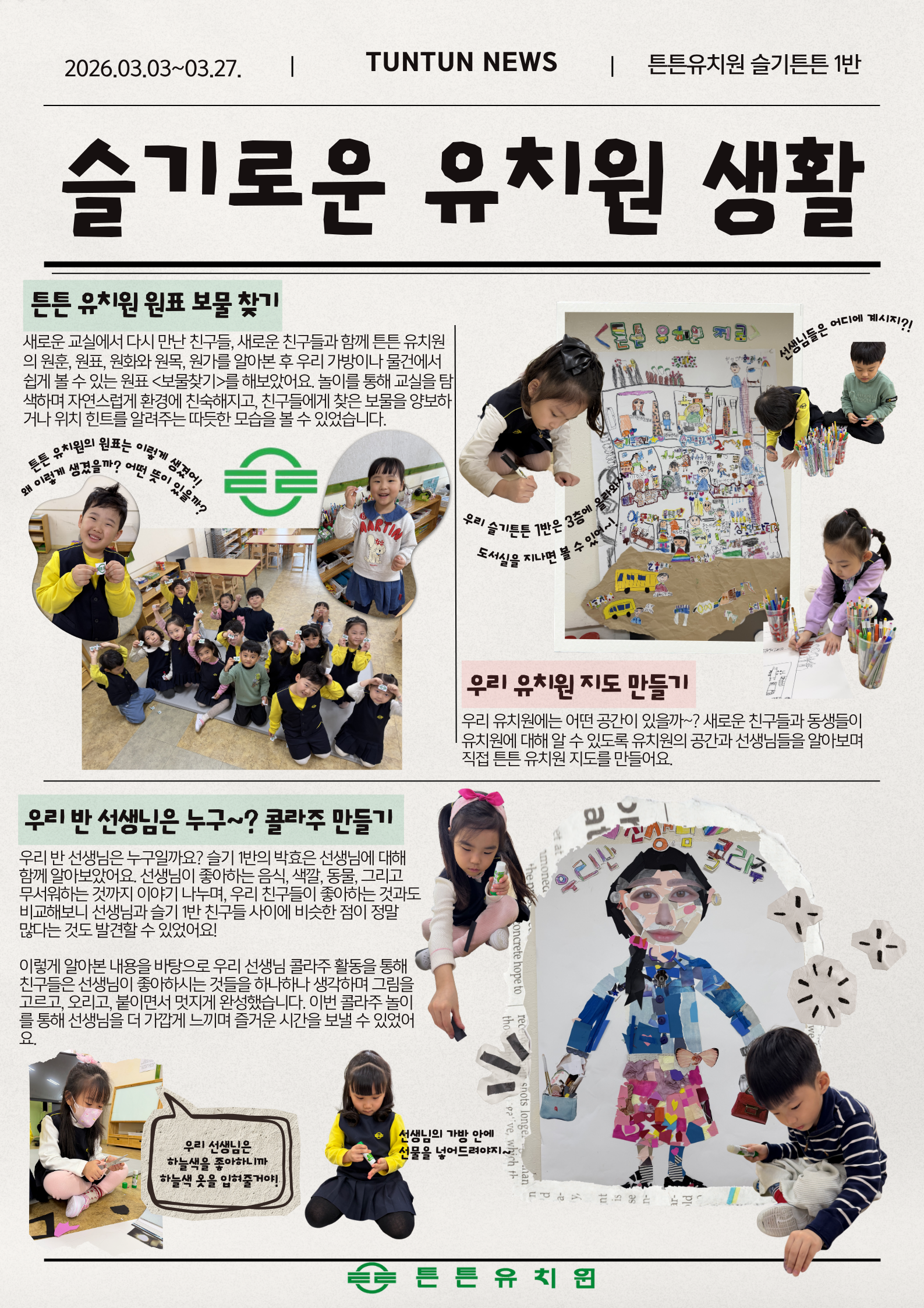 3월 슬기튼튼 1반 저널입니다. By 박효은|2026년 4월 16일|Tags: 3월 슬기튼튼 1반 저널| 7살이 되어 새로운 교실, 친구들과 선생님과 즐겁게 놀이하며 협동심을 기르고 슬기 1반에 대한 소속감을 느낀 3월의 놀이 저널입니다~^^