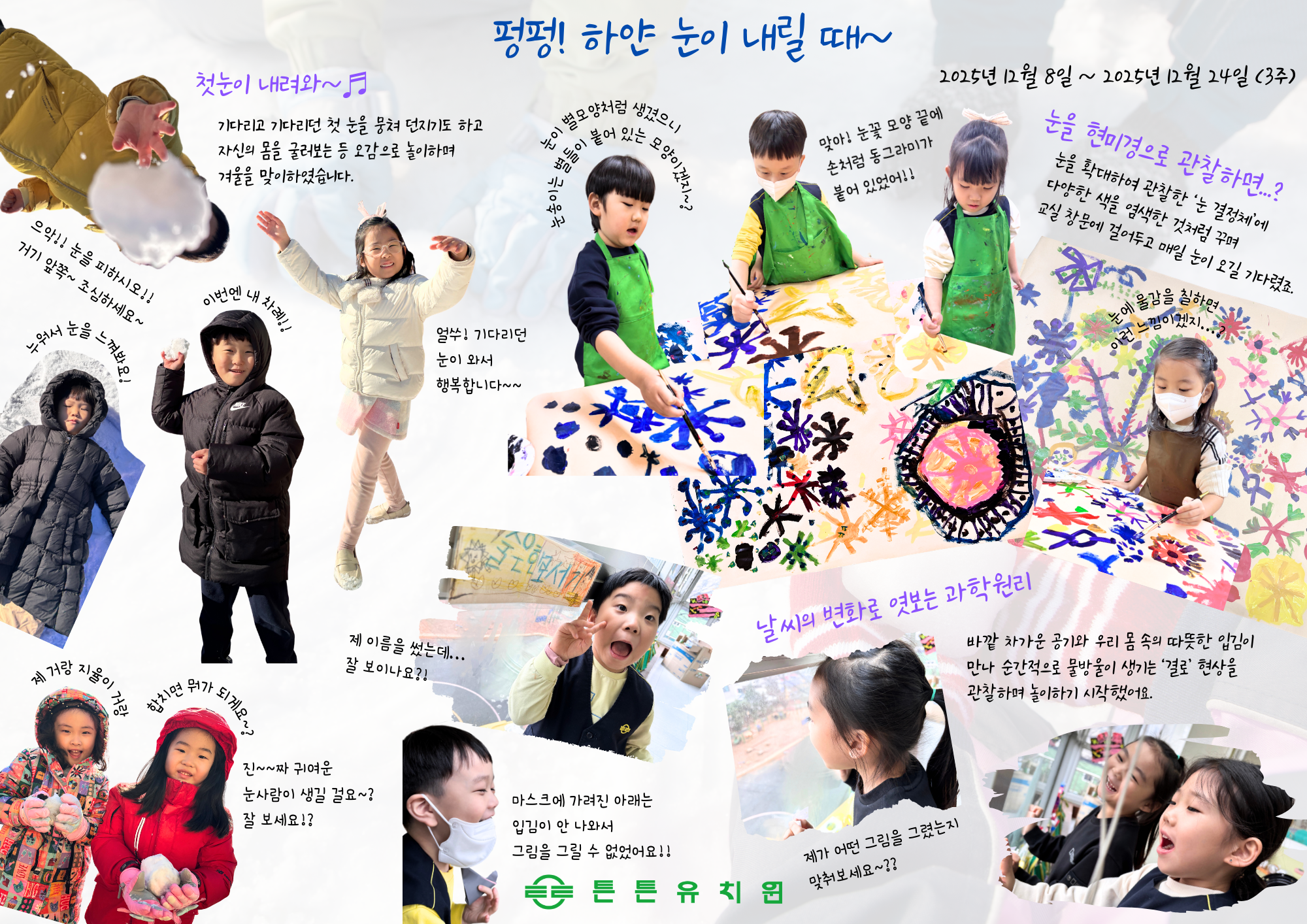 겨울방학 전 12월 3주 동안 재미있게 놀이한 아이들의 모습이 담겨 있습니다. 비슷한 겨울놀이 속에서도 주도적이고 협력적인 힘으로 놀이를 이끌어가는 흐름 중심으로 읽어주세요~!!❤️