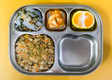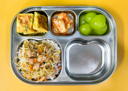 우유② 67kcal/3g, 목살굴소스볶음밥⑤⑥⑩⑱, 청포묵무침⑤⑥, 후식-귤, 배추김치⑨, 떠먹는 요거트 ( 칼로리/단백질 537cal/18g ) ❖ 튼튼 유치원의 급식은 인공조미료를 전혀 사용하지 않고, 멸치, 다시마, 표고버섯, 건새우, 무 등의 천연재료로 맛을