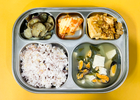 우유② 67kcal/3g, 잡곡밥, 홍합시금치된장국⑤⑥⑱, 돈육두부양념조림⑤⑥, 가지볶음⑤⑥, 배추김치⑨, 짜먹는 요거트② (칼로리/단백질 528kcal/14g) ❖ 튼튼 유치원의 급식은 인공조미료를 전혀 사용하지 않고, 멸치, 다시마, 표고버섯, 건새우, 무 등의 천연재료로 맛을 내고