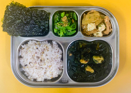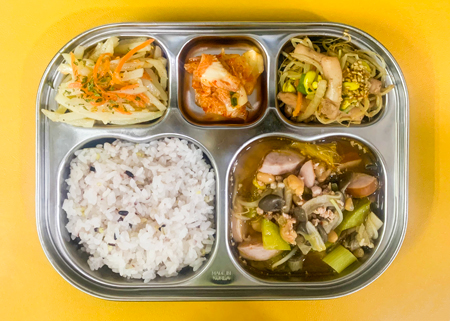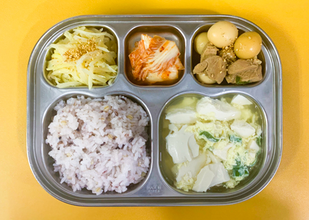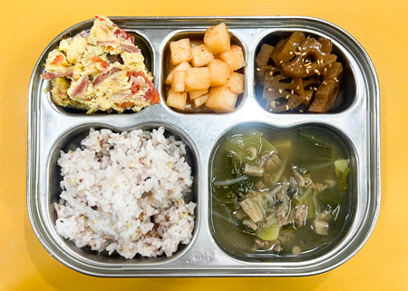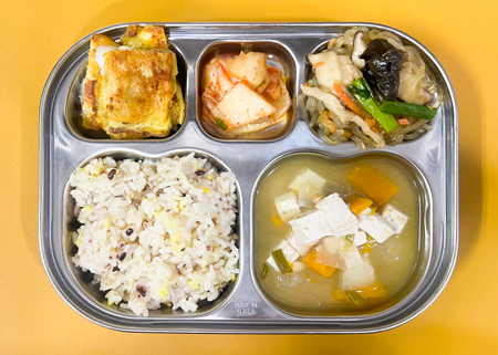 우유② 67kcal/3g, 잡곡밥, 부대찌개⑤⑥⑩⑫, 오징어콩나물찜⑤⑥⑰, 감자채볶음⑤⑥, 배추김치⑨, 두유⑤ ( 칼로리/단백질 542kcal/24g ) ❖ 튼튼 유치원의 급식은 인공조미료를 전혀 사용하지 않고, 멸치, 다시마, 표고버섯, 건새우, 무 등의 천연재료로 맛을