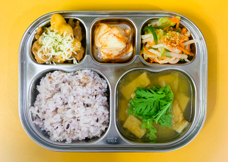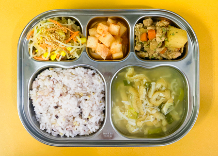우유② 67kcal/3g, 잡곡밥, 팽이버섯된장국⑤⑥, 닭볶음탕⑤⑥⑮, 콩나물무침⑤, 깍두기⑨, 사과당근쥬스 (칼로리/단백질 520kcal/25g) ❖ 튼튼 유치원의 급식은 인공조미료를 전혀 사용하지 않고, 멸치, 다시마, 표고버섯, 건새우, 무 등의 천연재료로 맛을 내고 있습니다.