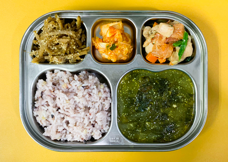 우유② 67kal/3g, 잡곡밥, 배추된장국⑤⑥, 간장오리주물럭⑤⑥⑱, 청포묵무침⑤⑥, 배추김치⑨, 방울토마토⑫ ( 칼로리/단백질 597kcal/21g ) ❖ 튼튼 유치원의 급식은 인공조미료를 전혀 사용하지 않고, 멸치, 다시마, 표고버섯, 건새우, 무 등의 천연재료로 맛을