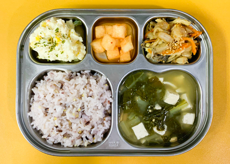 우유② 67kcal/3g, 잡곡밥, 근대된장국⑤⑥, 새우살버섯굴소스볶음⑤⑥⑨⑱, 감자샐러드①②⑤, 깍두기⑨, 방울토마토⑫ (칼로리/단백질 518kcal/22g) ❖ 튼튼 유치원의 급식은 인공조미료를 전혀 사용하지 않고, 멸치, 다시마, 표고버섯, 건새우, 무 등의 천연재료로 맛을 내고 있습니다.