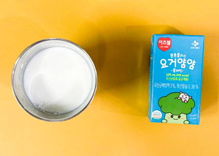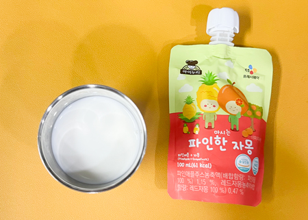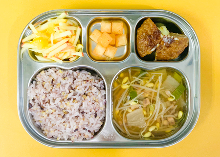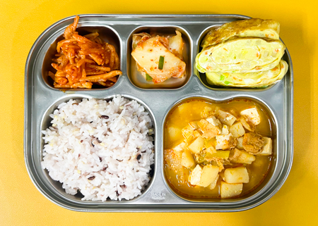 우유② 67kcal/3g, 잡곡밥, 감자된장국⑤⑥, 치즈를 얹은 치킨커리②⑤⑥⑮⑱, 코우슬로①⑤, 깍두기⑨, 과일쥬스 (칼로리/단백질 545kcal/23g) ❖ 튼튼 유치원의 급식은 인공조미료를 전혀 사용하지 않고, 멸치, 다시마, 표고버섯, 건새우, 무 등의 천연재료로 맛을