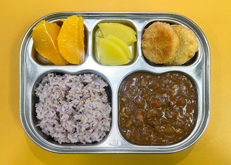 우유② 67kcal/3g, 돈육하이라이스②⑤⑥⑩⑫⑮⑯⑱, 크로켓①⑤⑥, 후식-오렌지, 단무지, 호두과자 ( 칼로리/단백질 619kcal/17g ) ❖ 튼튼 유치원의 급식은 인공조미료를 전혀 사용하지 않고, 멸치, 다시마, 표고버섯, 건새우, 무 등의 천연재료로 맛을 내고