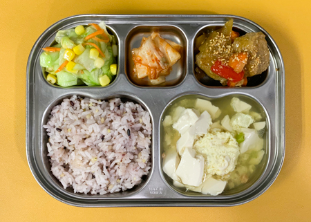 우유② 67kcal/3g, 잡곡밥, 맑은미역국⑤⑥, 고등어구이⑤, 돈육가지나물볶음⑤⑥⑩, 깍두기⑨, 요구르트②/오이스틱 ( 칼로리/단백질 537kcal/26g ) ❖ 튼튼 유치원의 급식은 인공조미료를 전혀 사용하지 않고, 멸치, 다시마, 표고버섯, 건새우, 무 등의 천연재료로 맛을