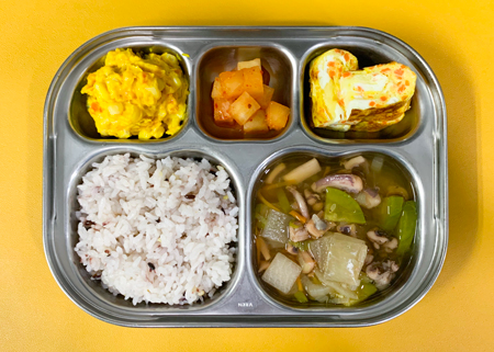 우유② 67kcal/3g, 잡곡밥, 오징어국⑤⑥⑰, 치즈당근달걀말이①②⑤, 콘샐러드①⑤, 깍두기⑨, 샤인머스캣쥬스 ( 칼로리/단백질 562kcal/21g ) ❖ 튼튼 유치원의 급식은 인공조미료를 전혀 사용하지 않고, 멸치, 다시마, 표고버섯, 건새우, 무 등의 천연재료로 맛을