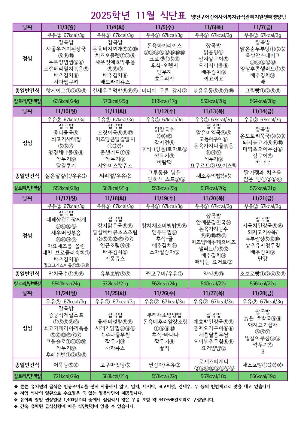 2025학년도 11월 친환경급식 식단표입니다.