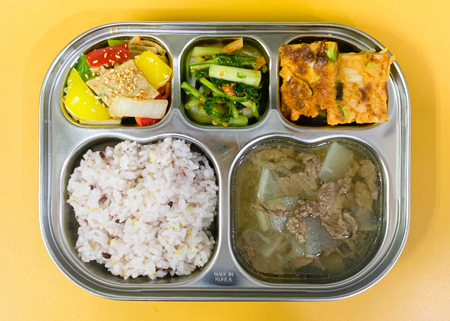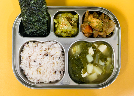 우유② 67kcal/3g, 잡곡밥, 근대된장국⑤⑥, 돼지갈비찜⑤⑥⑩, 오이지무침⑤⑥, 김구이, 치킨너겟①②⑤⑥⑮ ( 칼로리/단백질 539kcal/21g ) ❖ 튼튼 유치원의 급식은 인공조미료를 전혀 사용하지 않고, 멸치, 다시마, 표고버섯, 건새우, 무 등의 천연재료로 맛을