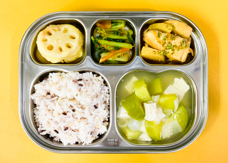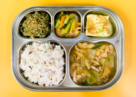 우유② 67kcal/3g, 잡곡밥, 부대찌개⑤⑥⑩⑫, 오징어콩나물찜⑤⑥⑰, 감자채볶음⑤⑥, 배추김치⑨, 두유⑤ ( 칼로리/단백질 542kcal/24g ) ❖ 튼튼 유치원의 급식은 인공조미료를 전혀 사용하지 않고, 멸치, 다시마, 표고버섯, 건새우, 무 등의 천연재료로 맛을