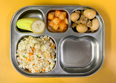 우유② 67kcal/3g, 뿌리채소영양밥, 돈육메추리알장조림①⑤⑥⑩, 후식-바나나, 깍두기⑨, 꿀떡 ( 칼로리/단백질 553kcal/22g ) ❖ 튼튼 유치원의 급식은 인공조미료를 전혀 사용하지 않고, 멸치, 다시마, 표고버섯, 건새우, 무 등의 천연재료로 맛을 내고