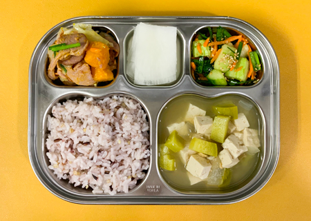 우유② 67kcal/3g, 잡곡밥, 애호박된장국⑤⑥, 훈제오리구이⑤⑥, 새콤달콤무쌈, 오이부추무침⑤⑥, 요거얌얌② ( 칼로리/단백질 567kcal/18g ) ❖ 튼튼 유치원의 급식은 인공조미료를 전혀 사용하지 않고, 멸치, 다시마, 표고버섯, 건새우, 무 등의 천연재료로 맛을