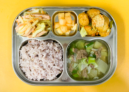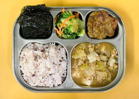 우유② 67kcal/3g, 잡곡밥, 청국장찌개⑤⑥⑩, 동그랑땡구이①②⑤⑥⑩⑫⑮⑯⑱, 봄동무침⑤⑥, 김구이 ( 칼로리/단백질 613kcal/34g ) ❖ 튼튼 유치원의 급식은 인공조미료를 전혀 사용하지 않고, 멸치, 다시마, 표고버섯, 건새우, 무 등의 천연재료로 맛을 내고