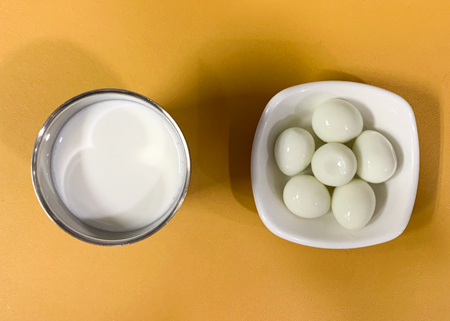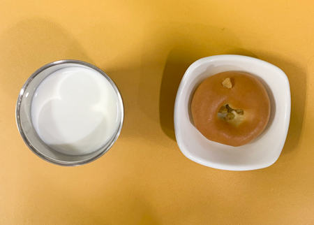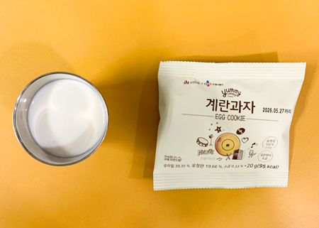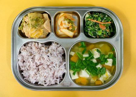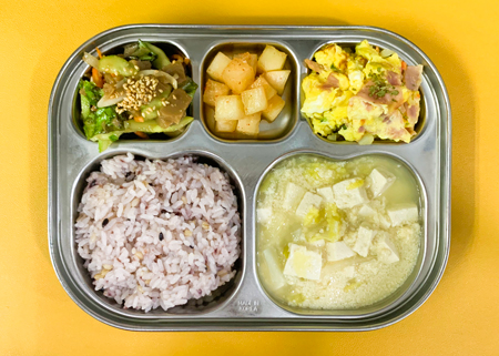 우유② 67kcal/3g, 잡곡밥, 콩가루배추된장국⑤⑥, 달걀베이컨스크램블①②⑤⑩, 도토리묵무침⑤⑥, 깍두기⑨ ( 칼로리/단백질 604kcal/20g ) ❖ 튼튼 유치원의 급식은 인공조미료를 전혀 사용하지 않고, 멸치, 다시마, 표고버섯, 건새우, 무 등의 천연재료로 맛을 내고
