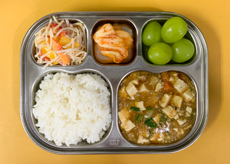 우유② 67kcal/3g, 마파두부덮밥⑤⑥⑱, 맛살파프리카나물⑤⑥, 포도, 배추김치⑨ ( 칼로리/단백질 616kcal/22g ) ❖ 튼튼 유치원의 급식은 인공조미료를 전혀 사용하지 않고, 멸치, 다시마, 표고버섯, 건새우, 무 등의 천연재료로 맛을 내고 있습니다.