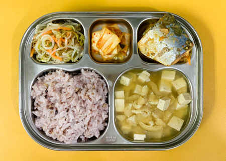 우유② 67kcal/3g, 잡곡밥, 유부된장국⑤⑥, 고등어살양념찜⑤⑥⑦, 숙주나물, 배추김치⑨ ( 칼로리/단백질 577kcal/23g ) ❖ 튼튼 유치원의 급식은 인공조미료를 전혀 사용하지 않고, 멸치, 다시마, 표고버섯, 건새우, 무 등의 천연재료로 맛을 내고
