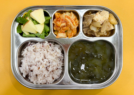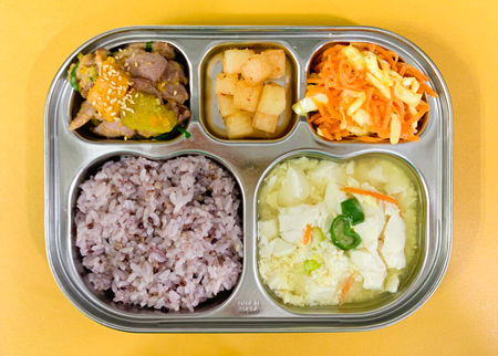 우유② 67kcal/3g, 잡곡밥 ,맑은미역국⑤⑥, 돈육두루치기⑤⑥⑩, 상추유자청샐러드⑤⑥, 배추김치⑨ ( 칼로리/단백질 557kcal/21g ) ❖ 튼튼 유치원의 급식은 인공조미료를 전혀 사용하지 않고, 멸치, 다시마, 표고버섯, 건새우, 무 등의 천연재료로 맛을 내고